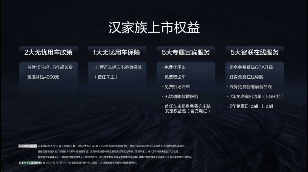 此次,产品实力全面进阶的汉宗族4款车型,归纳补助后价格区间为21.58-32.98万元,一起为用户预备了2大无忧购车方针、1大无忧用车保证、5大专属贵宾服务、5大智联在线服务等多重购车礼遇。