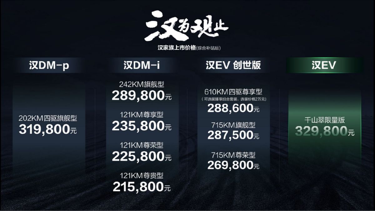 比亚迪发布汉宗族产品全新阵型。其间,汉EV创世版以纯电轿车引领者姿势领创715km续航路程,汉EV千山翠定量版特别配色打造运动潮奢模范,汉DM-i可油可电、敞开中大型轿车“4.2L亏电油耗+1300km归纳续航”新时代,汉DM-p更以推翻功用缔造中大型轿车“3.7s零百加快+5.2L亏电油耗”的硬核实力新高度。