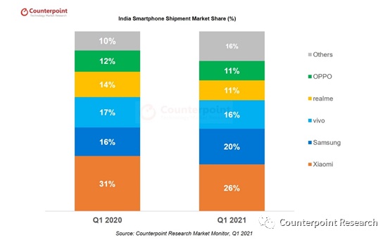 研讨分析师Shilpi Jain就竞赛格式和品牌战略评论道,“2021年榜首季度,我国品牌在印度智能手机商场占有75%的比例。小米以26%的比例领跑商场,其次是三星、vivo、realme和OPPO。近期,小米携手新的EMS协作伙伴扩张了产能,提高了出货量。一切头部厂商都在活跃发布新机,影响顾客需求。三星发布了多款Galaxy M系列、Galaxy F系列和Galaxy S21系列新机。realme推出了8系列,一加推出了9系列,小米则发布了Redmi Note 10系列。各大品牌还纷繁展开促销活动,给予财政鼓励,以拉动顾客需求。”
