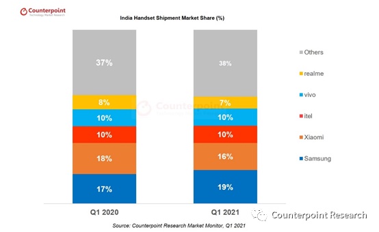 2021年榜首季度,印度手机商场同比增加19%,功用手机和智能手机商场都体现出色。遭到JioPhone新机型热销和后续促销活动的推进,功用手机商场同比增加14%。不过,itel仍领跑功用手机商场,占有21%的比例。
