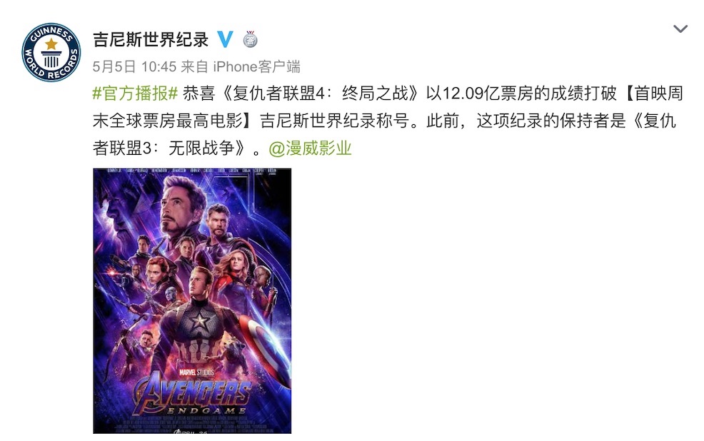 的电影。这部漫威电影世界终章在世界各地的上映首周末取得了令人震惊的 12 亿美元票房成果,一起自上映以来打破了多项纪录:有史以来票房收入最高的周四上映电影、首映周末全球票房最高电影、在我国和印度的最高首周末票房、有史以来第二高周末票房、票房最快超越 10 亿美元以及最快到达 20 亿美元的电影。