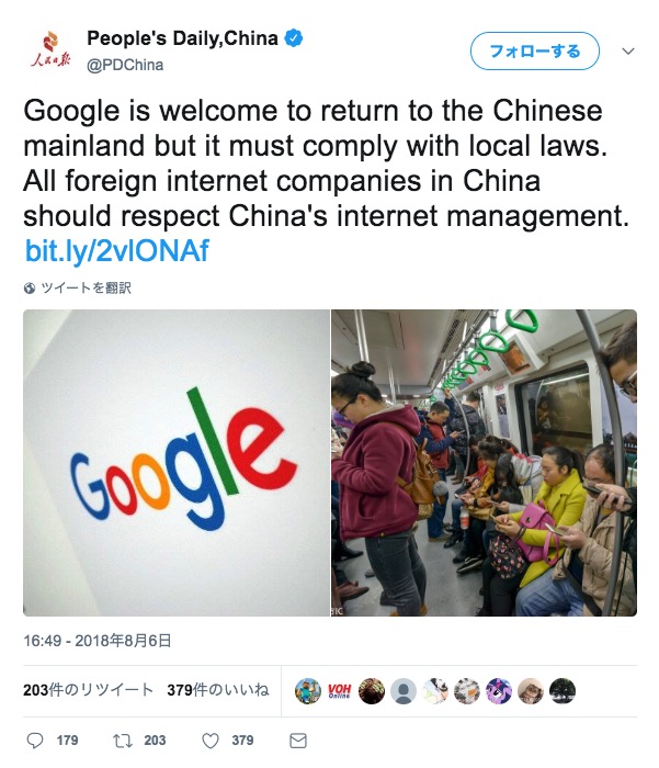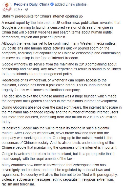 ,称 Google 在 2010 年退出我国大陆是一个巨大的过错,这使该公司错过了我国互联网开展的黄金时期。人民日报在文章中表明欢迎 Google 重返我国大陆,但条件是它有必要恪守我国法令。